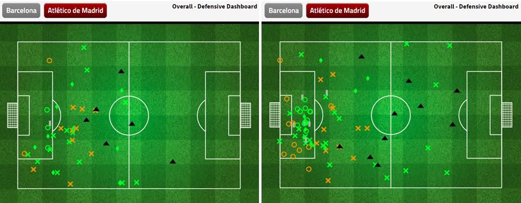 Pada gambar di atas, bisa dilihat jelas aksi bertahan Atletico sebelum bermain dengan 10 pemain adalah kebanyakan berada di tengah sampai depan wilayah kotak penalti mereka sendiri. Namun, setelah bermain dengan 10 pemain, aksi bertahan mereka kebanyakan dilakukan di daerah kotak penalti mereka sendiri. Setelah itu praktis Barcelona mampu menguasai pertandingan sepenuhnya.