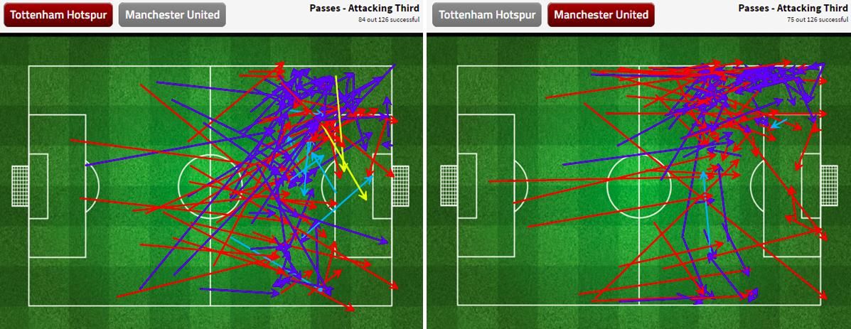 Gambar 3 Perbandingan grafik operan ke sepertiga wilayah penyerangan dari Tottenham Hotspur (kiri) dan Manchester United (kanan) - sumber: FourFourTwo Stats Zone