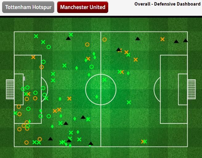 Jika kita lihat Gambar 2 di atas, kita bisa melihat aksi defensif yang dilakukan oleh United, terutama tekel (gambar X), banyak terjadi di wilayah lapangan Spurs (United menyerang ke arah kanan). Sebanyak 6 tekel sukses berhasil mereka cetak dari 11 kali percobaan di wilayah lapangan Spurs.