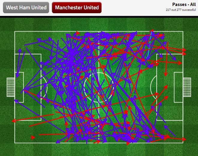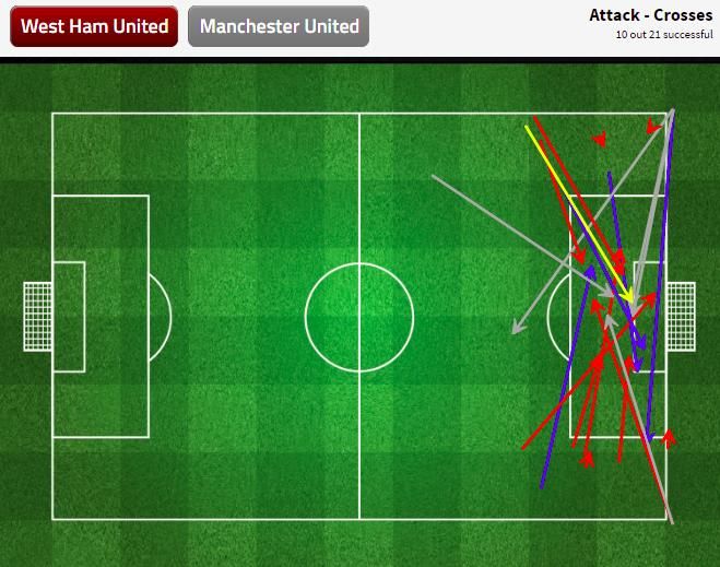 Sekali-kalinya United mampu melakukan penetrasi adalah dengan umpan silang. Tapi ketika umpan silang dilepaskan, sudah ada lima sampai enam pemain West Ham di dalam kotak penalti ditambah sisanya yang menjaga area luar kotak penalti.