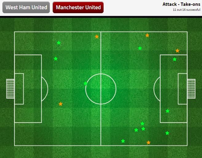 Permainan Mata yang sering melakukan cut inside membuat pertahanan West Ham terfokus kepadanya. Sebanyak 11 dribel sukses dari 14 usaha dribel berhasil United cetak, 6 di antaranya terjadi kanan,Β 2 di antaranya adalah dribel Mata, dan 4 sisanya adalah hasil dari pergerakan Mata yang memancing para pemain West Ham.