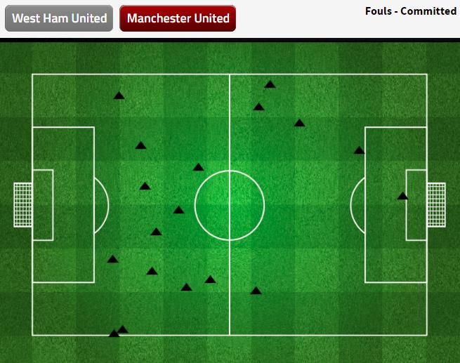 Sebanyak 11 pelanggaran dilakukan United yang tergolong menghasilkan tendangan bebas di posisi yang berbahaya (lihat gambar 5). Wilayah ini adalah wilayah yang sangat berbahaya untuk United karena West Ham memiliki seorang Dimitri Payet.