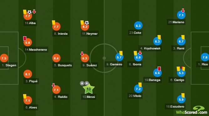 Gambar 1 β susunan sebelas pemain utama Barcelona dan Sevilla β sumber: WhoScored.