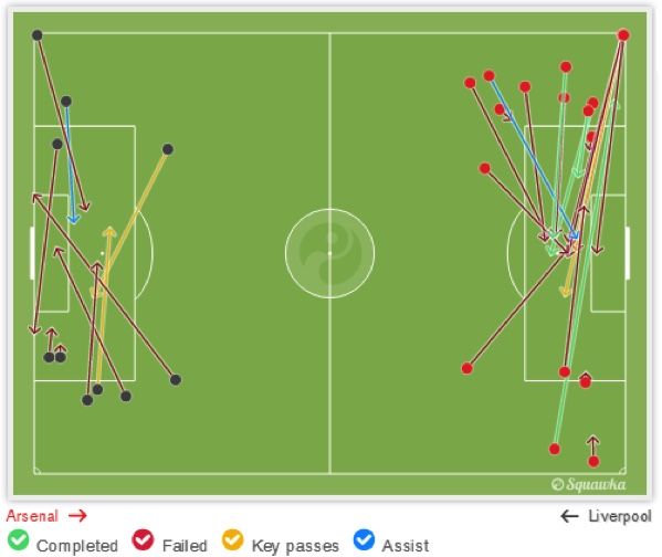 Arsenal coba memecah kebuntuan juga dengan memanfaatkan bola lambung (6 umpan silang berhasil dari 20 percobaan dan 9 bola panjang berhasil di sepertiga akhir dari 16) yang terbukti bisa membuat Liverpool panik. Liverpool sendiri lemah dalam bola udara, di mana mereka hanya memenangkan 32% di antaranya.