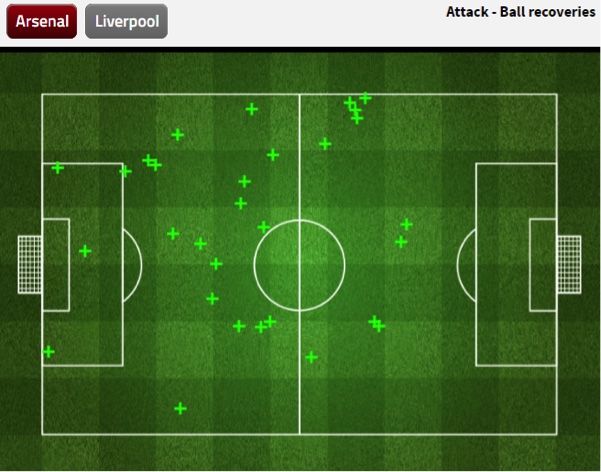 Ball recovery yang dilakukan oleh Arsenal sepanjang babak pertama. Sumber: FourFourTwo Stats Zone |