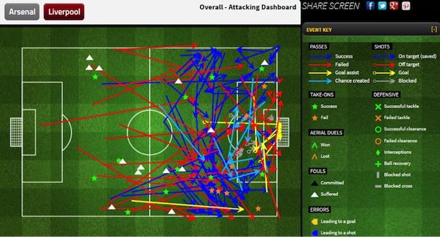 Grafis umpan silang Liverpool (kiri) dan Arsenal (kanan). Sumber: Squawka |