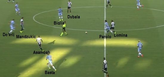 Hasil dari man marking Lazio pun begitu signifikan. Mario Mandzukic yang ditaruh di depan sendirian sangat jarang mendapatkan bola. Sementara trio Paulo Dybala, Sami Khedira, dan Kwadwo Asamoah yang ditugaskan mengirim bola dan bergantian ke lini depan juga tidak mendapatkan akses masuk yang cukup.