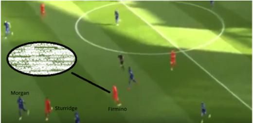 Gambar 2 β Pergerakan Sturridge yang menarik Wes Morgan dan menyajikan ruang bagi Roberto Firmino. Sumber: YouTube