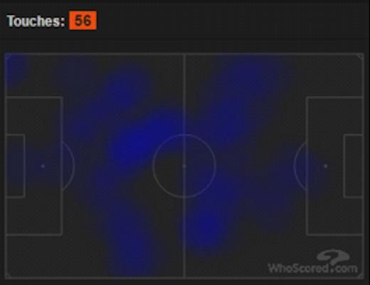 Gambar 4 β Area gerak Wijnaldum. Ia adalah gelandang yang cukup rajin bergerak dalam pertandingan kali ini. Sumber: whoscored.com |