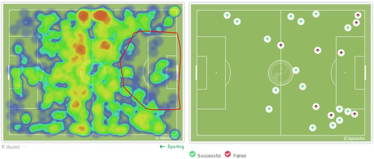 Gambar 3 – Grafis heat map Real Madrid dengan sorotan minimnya Real Madrid berhasil menguasai bola di wilayah sekitar kotak penalti Sporting (kiri). Grafis dribel Real Madrid (kanan) – sumber: Squawka