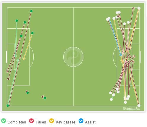 Sebanyak tiga peluang berhasil Sporting ciptakan lewat serangan menuju tengah, sementara Real Madrid menciptakan 8 peluang tapi tidak ada satupun yang berasal dari operan di wilayah tengah, bahkan 5 di antaranya berasal dari umpan silang.