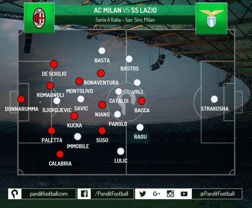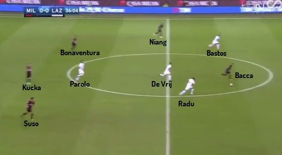 Sering sejajarnya Giacomo Bonaventura dengan Montolivo dan Kucka membuat pemain depan Milan kesulitan untuk mendapatkan bola karena tidak adanya penghubung. Kondisi ini diperkuat dengan penempatan posisi dua gelandang tengah Lazio yang kerap berada di depan trio lini depan Milan. Milan pun pada akhirnya begitu mengandalkan kedua sisi sayap untuk membongkar lini belakang Lazio.
