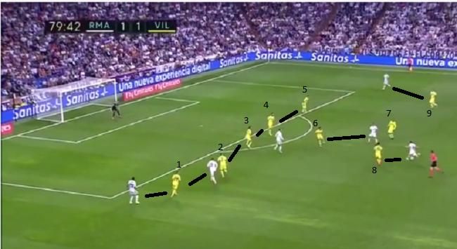 Tampak dari ilustrasi di atas, bahwa The Yellow Submarine ingin mencegah aksi-aksi menembus ke belakang ataupun aksi-aksi cut inside yang kerap dilakukan oleh Ronaldo ataupun Bale. Berkat pertahanan rapat ini, para penyerang Madrid sulit untuk masuk ke dalam kotak penalti Villarreal. Kroos yang sedang menguasai bola pun tidak memiliki banyak pilihan karena ruang-ruang dalam pertahanan berhasil ditutup dengan baik oleh pemain-pemain Villarreal.