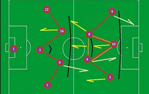 Witarsa mengatakan, peran gelandang dalam WM offensive mirip seperti pada poros halang dalam sistem ortodoks – mereka bertugas menyerang dan bertahan. Sekilas ini terdengar mirip dengan poros ganda di formasi 4-2-3-1 bukan?