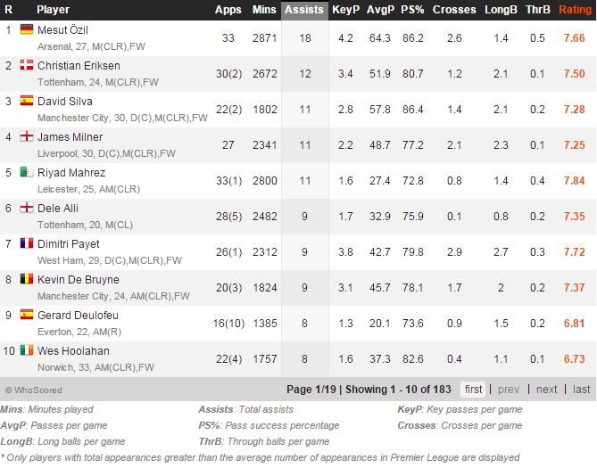 Kemudian jika kita melihat daftar assist, ia juga bukan berada di posisi teratas. Mesut Özil lah pemain yang paling dermawan di Liga Primer dengan 18 assist. Sementara Mahrez yang mencetak 11 assist berada di peringkat ketiga di bawah Christian Eriksen (12). Jumlah assist-nya sama dengan David Silva dan James Milner sampai pekan ke-35 ini.
