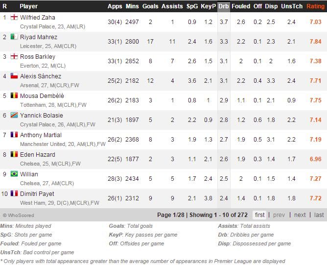 Rekap dribel pemain-pemain Liga Primer Inggris - sumber: WhoScored