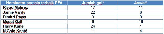 Tabel perbandingan para nominator PFA Player of the Year, angka dihitung sampai pemenang diumumkan, bukan sampai hari ini.