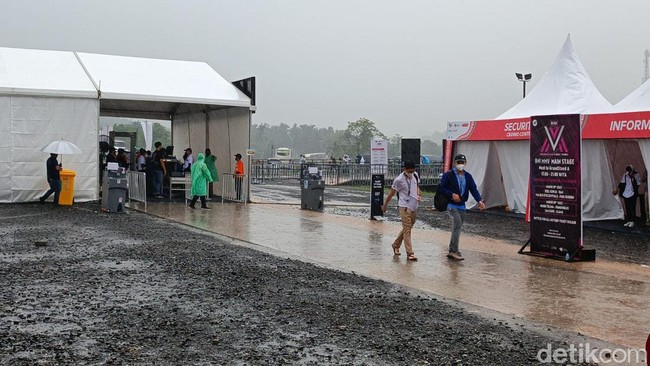 Jakarta - Kawasan Sirkuit Mandalika diguyur hujan menjelang race MotoGP. Para penonton berlarian mencari tempat mengadu, tapi ada juga yang memakai payung hingga jas hujan.