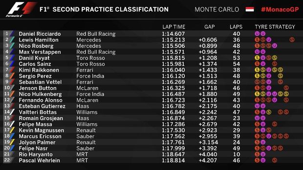 Pada sesi kedua yang dihelat di Circuit de Monaco, Monte Carlo, Kamis (26/5/2016) malam WIB, Ricciardo tampil sangat kencang. Dia menorehkan waktu 1 menit 14,607 detik, unggul 0,606 detik dari driver Mercedes GP Lewis Hamilton di posisi kedua.