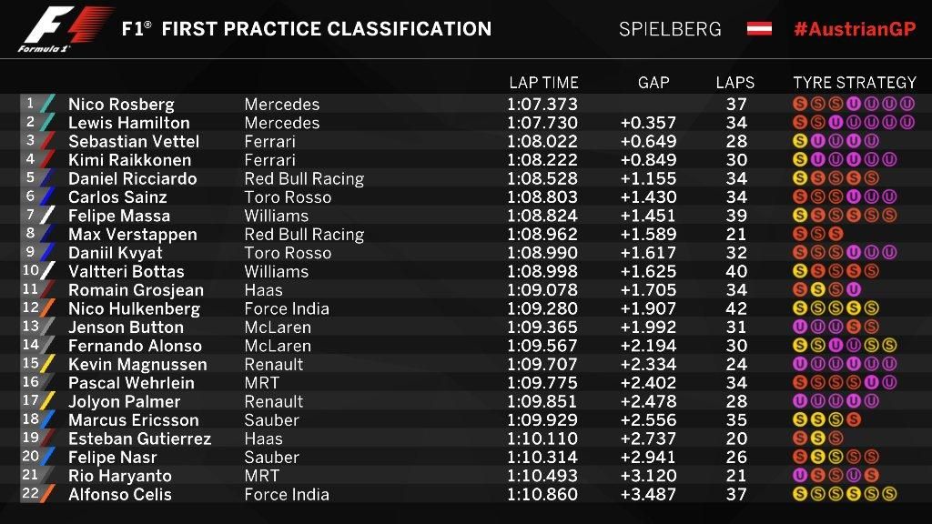 Pada sesi yang berlangsung di Sirkuit Red Bull Ring, Spielberg, Jumat (1/7/2016) sore WIB, Rosberg menorehkan catatan waktu 1:07,373 detik, yang mana --menurut catatan Formula 1-- merupakan lap time terbaik yang pernah dicatatkan di Sirkuit Red Bull Ring.
