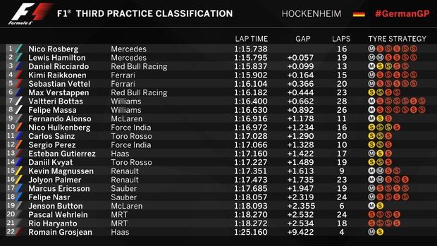 Pada sesi yang dihelat di sirkuit Hockenheim, Sabtu (30/7/2016) sore WIB, Rosberg mencatatkan waktu 1 menit 15,738 detik setelah melahap 16 putaran. Dia unggul 0.057 dari Hamilton di posisi kedua yang punya 19 lap.