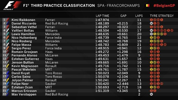 Pada latihan ketiga yang digelar di Sirkuit Spa-Francorchamps, Sabtu (27/8/2016), Raikkonen mengemas 1 menit 47,974 detik. Ini adalah waktu tercepat di sepanjang sesi latihan bebas.