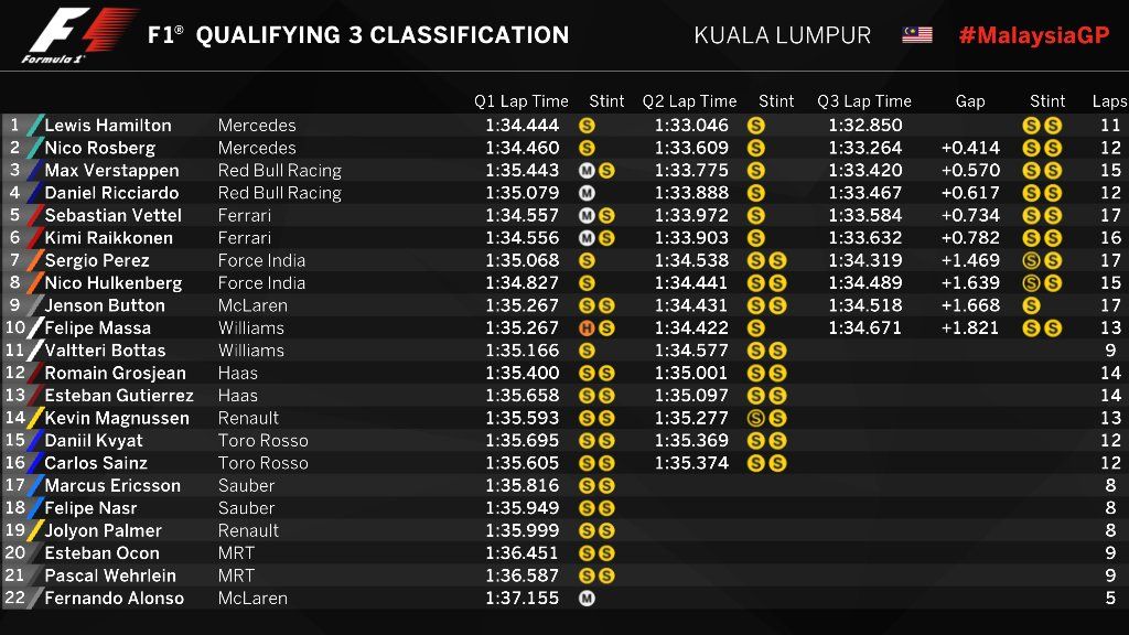 Peringkat tiga di sesi ini ditempati oleh pebalap Red Bull Max Verstappen, yang pada sesi kedua sempat mencatat waktu terbaik kedua melampaui Rosberg. Rekan setimnya, Daniel Ricciardo, berada di posisi empat.