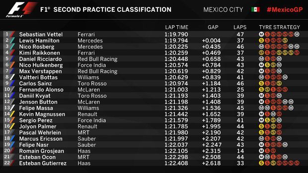 Sabtu (29/10/2016) dini hari WIB, di Sirkuit Autodromo Hermanos Rodriguez, Meksiko City, Vettel menjadi pebalap tecepat setelah menorehkan catatan waktu 1:19,790 detik. Sedangkan Hamilton menorehkan catatan waktu 1:19,794 detik, hanya berselisih 0,004 detik dari Vettel.
