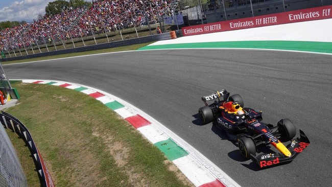 Balapan F1 GP Italia digelar di Sirkuit Monza, Minggu (11/9/2022) malam WIB. Verstappen jadi pebalap pertama yang menyentuh garis finis, mengungguli pebalap Ferrari Charles Leclerc.