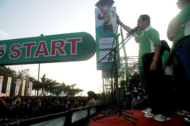 Gubernur DKI Jakarta, Fauzi Bowo memberi aba-aba tembakan tanda dimulainya Jakarta International 10K, Minggu (20/5/2012)pagi.