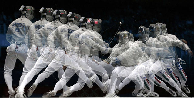 Pemain anggar asal Rumania Rares Dumitrescu (kiri) melawan pemain atlit anggar asal Italia Diego Occhiuzzi pada Olimpiade London, Minggu (29/7) waktu setempat. Kesan dramatis lebih terasa karena menimbulkan efek gerak yang sangat heroik. (REUTERS/Max Rossi).