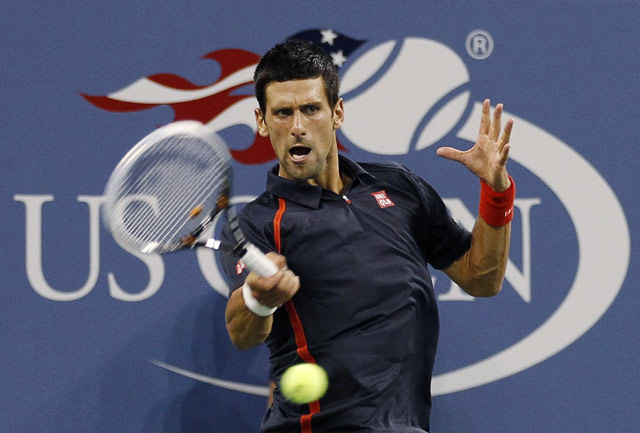 Bertanding di Arthur Ashe Stadium, New York, Rabu (29/8/2012) pagi WIB, Djokovic hanya butuh waktu 73 menit untuk memulangkan Paolo Lorenzi. REUTERS/Adam Hunger.