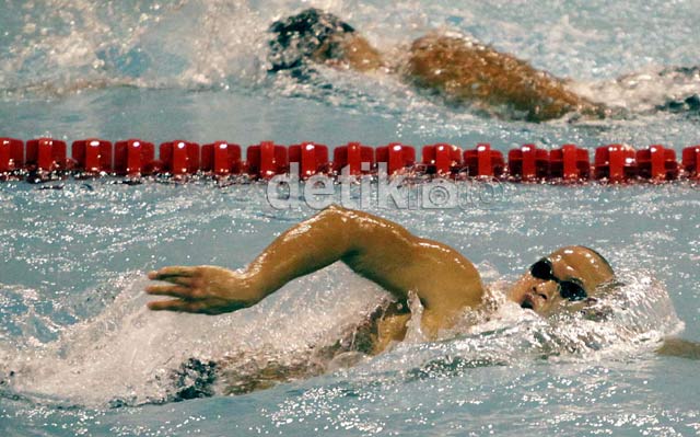 Jakarta - Perenang senior Akbar Nasution yang memperkuat Sumatera Selatan membuktikan ketangguhannya pada nomor 400 meter gaya ganti perorangan putra di Kolam Renang Sport Center Rumbai, Pekanbaru Riau, Minggu (9/9). Akbar menyumbangkan mendali emas untuk Sumatera Selatan setelah mengalahkan lawan-lawannya pada event PON XVIII Riau.