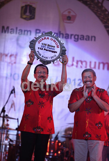 - Gubernur DKI Jakarta Fauzi Bowo menyerahkan penghargaan kepada sejumlah atet pada malam penghargaan Kontingen Jakarta di kawasan Ancol, Jakarta, Kamis (27/9/2012). Kontingen DKI Jakarta berhasil menjadi juara umum PON XVIII/2012 Riau setelah meraih 110 emas, 101 perak dan 112 perunggu.
