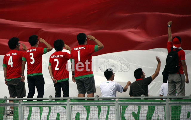 Jakarta - Dalam laga pertandingan babak penyisihan kedua Indonesia melawan Singapura, para pendukung merah putih yang berada di negeri jiran Malaysia, tetap menyempatkan diri untuk mendukung tim kebanggaan mereka. Ada saja yang dilakukan oleh pendukung merah putih ini. Salah satunya memakai jersey timnas yang bertulisan nama-nama mantan presiden Indonesia.