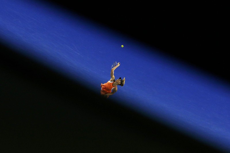 Maria Sharapova melakukan smash saat melawan Belinda Bencic. Jason O'Brien/Reuters/detikFoto.