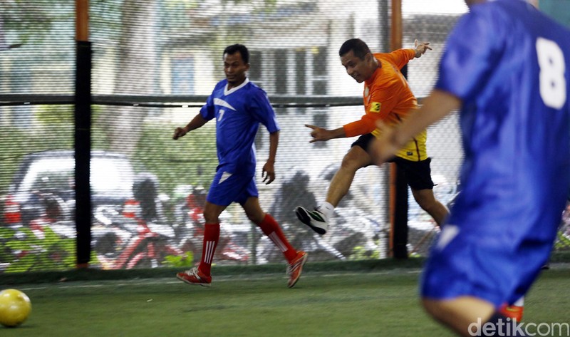 Aksi Menteri Perindustrian RI Saleh Husein saat bermain futsal di Planet Futsal, Jakarta, Minggu (20/3/2016).