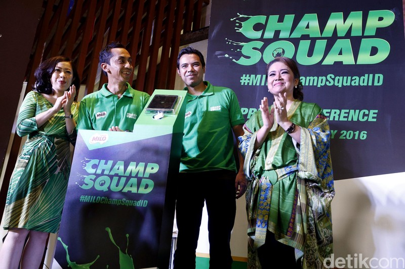 (Kiri-kanan) Dokter Pemerhati Gaya Hidup Grace Judio, Brand Manager Nestle Milo Jeffri Ricardo, Catagory Marketing Manager Milo Leonard Bimbuain, dan psikologi anak Roslina Verauli meluncurkan Milo Champ Squad. Perangkat itu dilengkapi dengan dua fitur utama, yaitu analisis nutrisi dan activity planner.