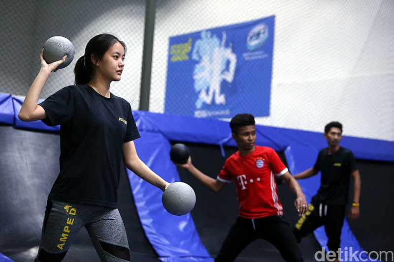 Dodgeball adalah olahraga yang dimainkan dengan trampolin. Pertandingan digelar selama empat babak. Setiap babak berdurasi tiga menit.