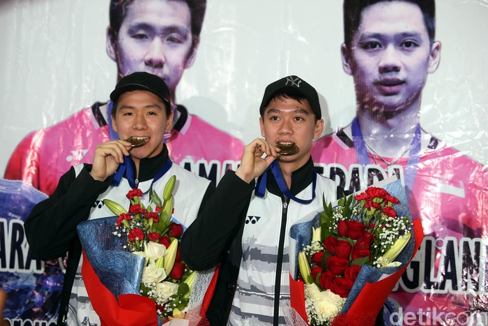 Jakarta - Ganda putra Kevin Sanjaya Sukamuljo/Marcus Gideon Fernaldi tiba di tanah air. Kedatangan juara All England 2017 itu disambut PBSI dan Menpora Imam Nahrawi.