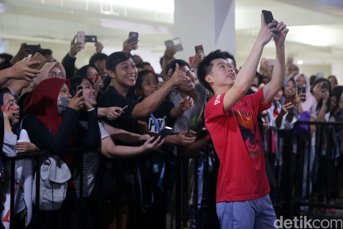 Jakarta - Kevin Sanjaya Sukamuljo menyempatkan menemui penggemarnya usai bertanding di Indonesia Masters 2018. Pebulutangkis Indonesia itu berswafoto bareng penggemar.
