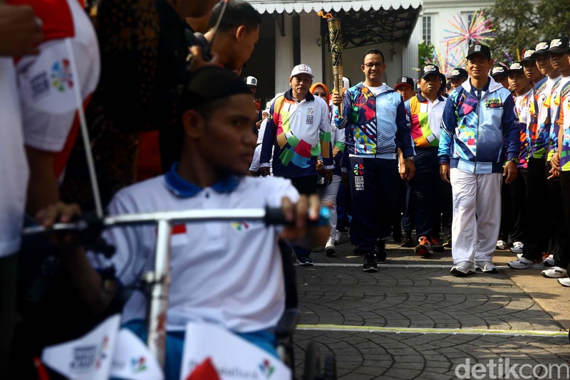 Gubernur DKI Anies Baswedan melepas rombongan pawai obor Asian Para Games 2018 dari Balai Kota DKI. Anies didapuk sebagai pembawa obor pertama.