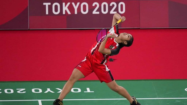 Jepang - Gregoria Mariska Tunjung menang atas Thet Htar Thuzar (Myanmar) pada laga penyisihan grup M Olimpiade Tokyo 2020. Begini aksinya.