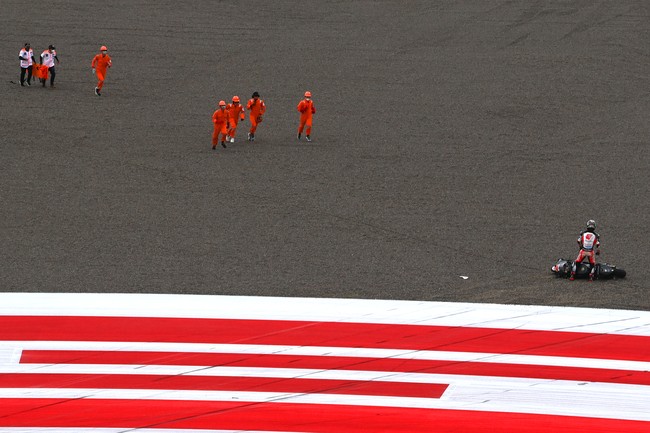 Marshall dan petugas kesehatan bergegas mendatangi rider LCR Honda Takaaki Nakagami yang terjatuh dalam tes MotoGP Mandalika. Foto: ANTARA/ANDIKA WAHYU