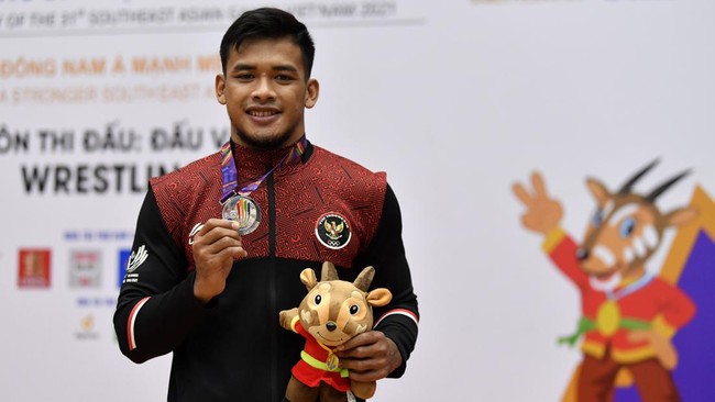 Pegulat Indonesia Andika Sulaeman meraih medali perak SEA Games, Selasa (17/5/2022). ANTARA FOTO/Zabur Karuru.