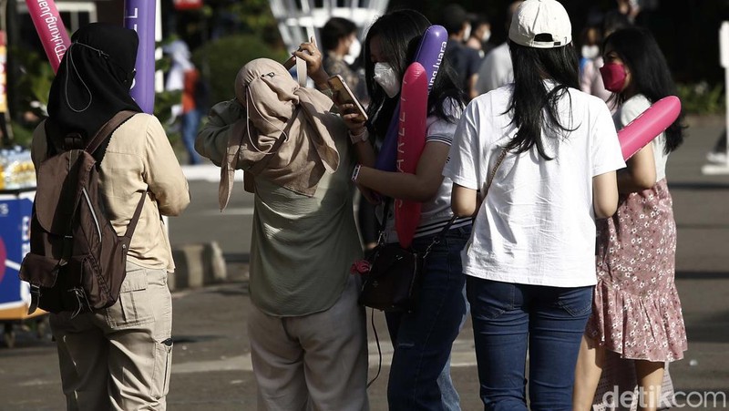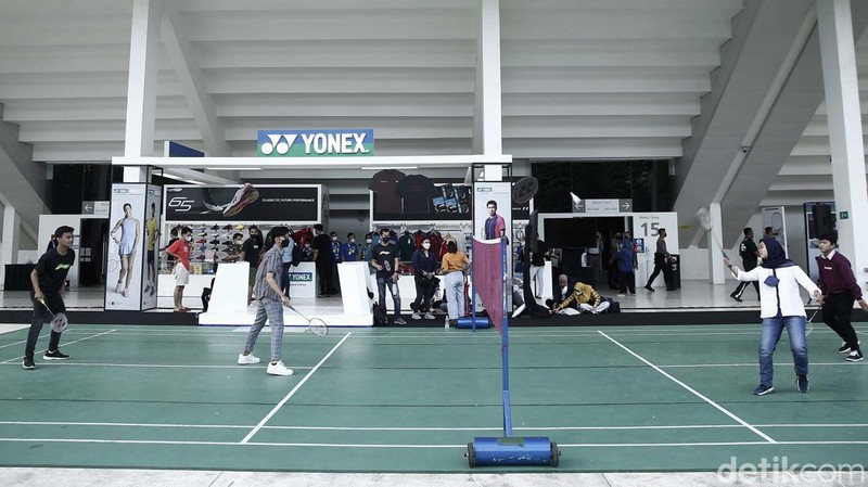 Penonton berpose di depan monumen shuttlecock raksasa.
