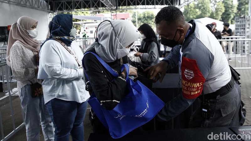 Petugas memeriksa menonton yang akan masuk ke Istora Senayan.