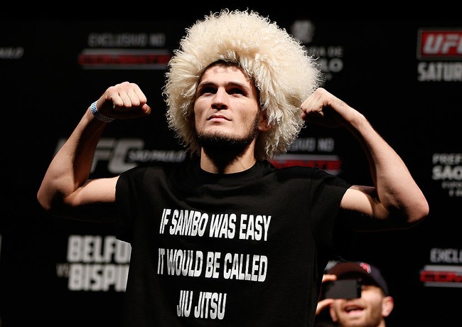 Kaus ini dipakai Khabib dalam sebuah pertarungan dalam kariernya. "Jika sambo itu mudah, bakal disebut jiu jitsu". Foto: Zuffa LLC via Getty Images/Josh Hedges