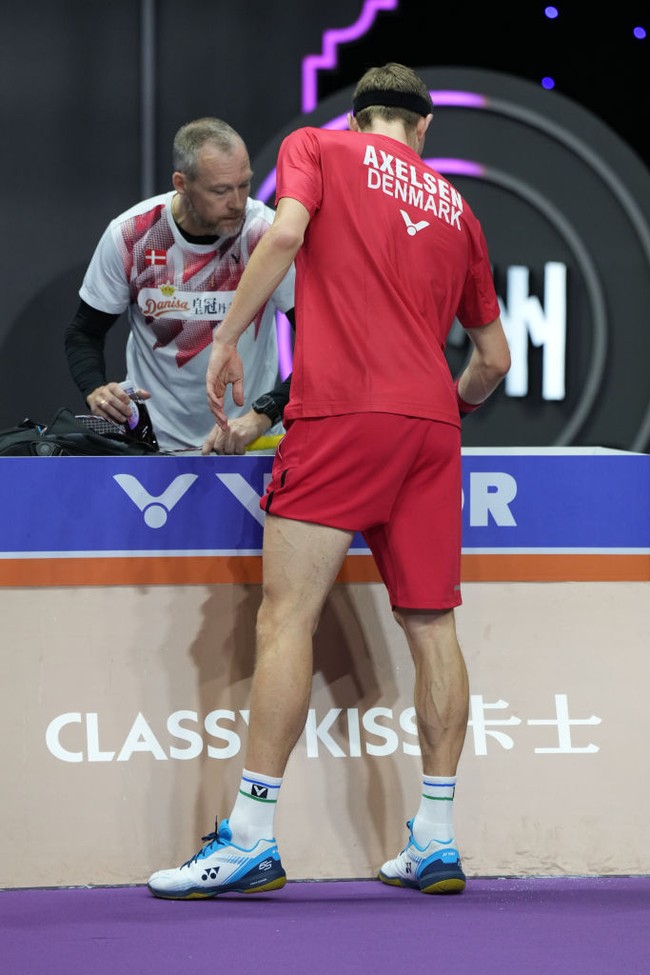 Axelsen menjadi andalan Denmark saat turun di partai kedua melawan Malaysia. Tapi di awal laga, Axelsen sudah tampak mengalami masalah. Foto: Getty Images/Fred Lee