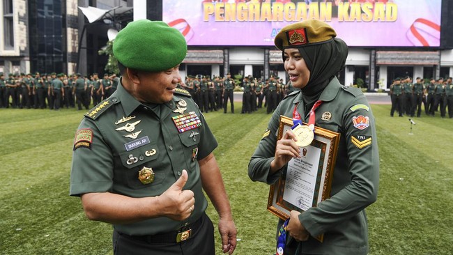Jenderal Dudung menyerahkan penghargaan kepada Sertu (K) Ressa Kania Dewi dalam upacara di Mabes TNI AD, Jakarta Pusat, Rabu (24/5/2023). Di ajang SEA Games, Sertu Ressa berhasil meraih dua medali yaitu emas dan perak di cabang olahraga renang.
